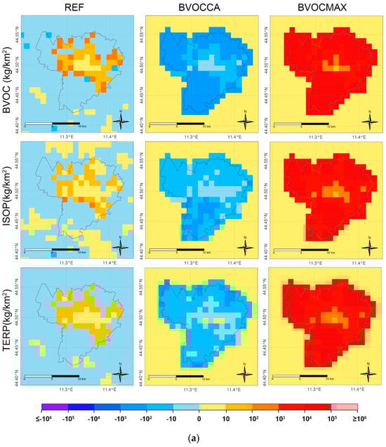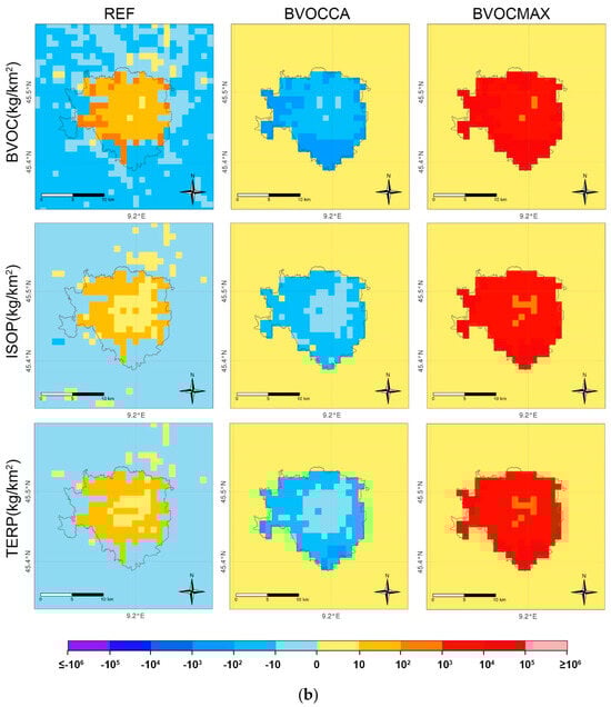 (a) Monthly sum of BVOC emissions differences (kg/km2) for the REF (left column), BVOCCA (central column), and BVOCMAX (right column) indicators, as defined in Table 2. The rows show the total BVOC emissions (upper panel), isoprene (ISOP) (middle panel), and terpenes (TERP) (bottom panel) emissions for July 2015 in Bologna. (b) As (a), for Milan.