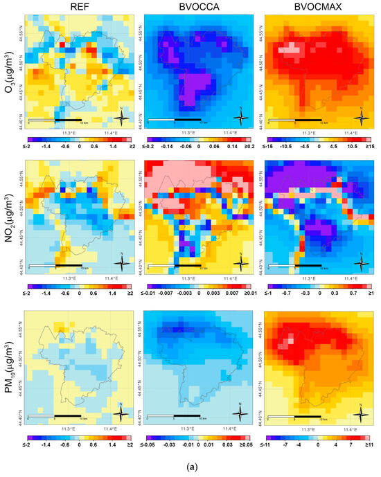 (a) Average monthly spatial variability in O3, NO2, and PM10 air concentration differences (REF, BVOCCA, BVOCMAX) (μg/m3) due to different vegetation emission factors over the city area for July 2015 in Bologna. (b) As (a), for Milan.