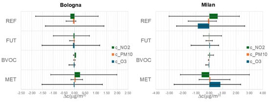 The decrease in NO₂ concentrations due to increased BVOC emissions (BVOCMAX) is considerably smaller compared to the changes observed for O₃ and PM₁₀. Specifically, NO₂ concentrations decrease by only −0.40 µg/m3 in Bologna and −0.81 µg/m3 in Milan under the BVOCMAX scenario.