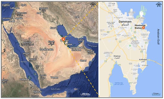 The ground-level PM10 mass concentrations were measured hourly from 1 January 2022 to 31 March 2022, within the scope of this study. Hourly ground-level PM10 mass concentrations were monitored using a continuous ambient dust monitor (Horiba APDA-371) installed in a mobile air quality monitoring station located near the College of Engineering building (26.4° N, 50.2° E) at Imam Abdulrahman Bin Faisal University (IAU) (Figure 1). The dust monitor, with a PM10 cut-off inlet located 5 m above the ground level (AGL) and approved by the European Standard CSN-EN 12341 (PM10) [43], measures and records airborne PM10 mass concentrations using the industry-proven principle of beta ray attenuation at a flow rate of 16.7 L/min. The dust monitor’s detection and maximum reading limits are 4.8 and 10,000 µg/m3, respectively. At the monitoring station, the dust monitor’s sampling channel was equipped with a smart heating unit connected to ambient temperature and humidity sensors, preventing condensation and minimizing humidity interference. In addition, local wind speed and wind direction data were recorded at 5 AGL by the Davis Vantage Pro2 meteorology station installed on the roof of the mobile air quality monitoring station.