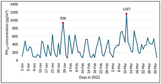 Daily average PM10 mass concentrations are depicted in Figure 2. The PM10 mass concentrations indicated significant variability over the observed period and ranged between 54 and 1167 µg/m3 with an average of 336 ± 213 µg/m3. The 90th percentile of the PM10 mass concentration data was 618 µg/m3. Among the six episodes, the two highest episodes were selected since they represent different months, January and March. The first episodic PM10 mass concentration was 938 µg/m3 on 28 January 2022, while the second was on 11 March 2022 with 1167 µg/m3. In the HYSPLIT dust storm simulations, the first episodic peak of 938 µg/m3 on 28 January 2022 is used for model calibration, while the second peak of 1167 µg/m3 on 11 March 2022 is selected for validating the calibrated model parameters.