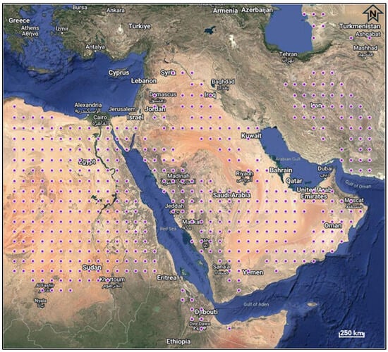 The HYSPLIT model was initially developed based on the threshold friction velocity concept. A dust storm occurs when wind speed surpasses this threshold, generating a suspended cloud of particles that can be lifted high into the atmosphere [28,30,32]. Previous studies have indicated that threshold friction velocity is one of the most crucial parameters affecting the accuracy of dust storm predictions [32,33,34,36,38]. In the dust storm algorithm of the HYSPLIT model, the threshold friction velocity is hardwired at 28 cm/s, which can be adjusted by the P10F multiplication factor in the SETUP CFG file. For instance, P10F = 1.0 simulates a dust storm at 28 cm/s, while P10F = 0.5 causes dust emissions to occur at half the default threshold velocity. Dust emission locations are determined from the land use files of the HYSPLIT file directories. Emissions are considered from areas coded as desert locations in the land use file. The HYSPLIT model generated 510 dust emission locations for the selected model domain, as indicated in Figure 4. Vertical dust flux is calculated by the model using Equation (1).