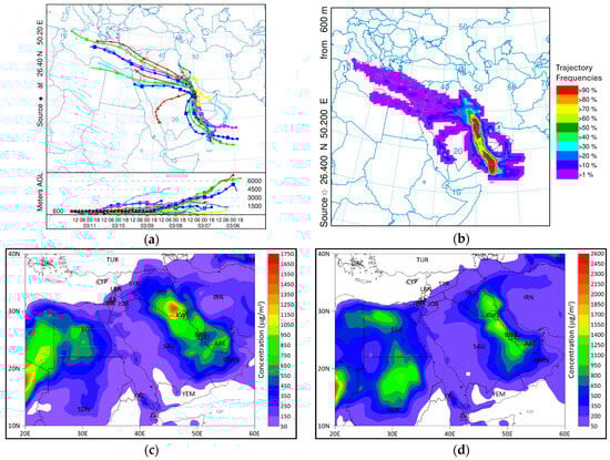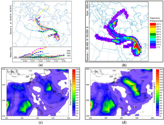 Figure 5b presents a frequency analysis of the air particle trajectories arriving in Dammam at 600 m ABLH. The trajectory frequencies above 90% are concentrated over the eastern region of Saudi Arabia, Qatar, Bahrain, Kuwait, and southern Iraq. Jordan and northeastern Egypt also indicated high trajectory frequency scores (70%). According to the wind direction and wind speed measurements at the surface level, northern wind directions dominated with an average wind speed of 7.4 m/s during the dust storm and the 24 h prior. Between 36 and 72 h before the dust storm, southern wind directions governed with an average wind speed of 5.3 m/s. Based on backward air particle trajectory calculations, frequency analysis, and measured wind data at the study area, it can be concluded that the dust emission sources in the northern part of Saudi Arabia, Kuwait, and southern Iraq have strong potential to contribute to the dust storm observed in Dammam.