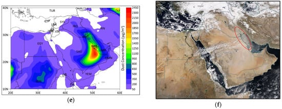 The satellite image of the dust storm captured on 11 March 2022 exhibits the spread of dust across the Arabian Peninsula (Figure 6f). The visible dust plume can be seen sweeping across the region, with a dense layer over Saudi Arabia and extending into the Gulf region (annotated with a red ellipse shapes). This image corroborates the data in Figure 6a,b,e and visually represents the dust event as observed from space. This comprehensive analysis underlines the significant regional transport of dust and its impact on air quality in the eastern region of Saudi Arabia.