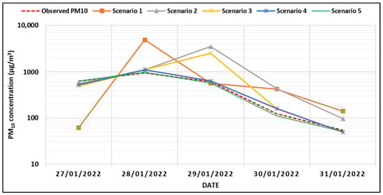 The model calibration process involves comparing the model’s outputs with actual observed data to assess its performance in simulating real-world conditions. It explicitly evaluates the HYSPLIT model’s forecasting of PM10 concentrations across five scenarios (Table 2). The specific dust storm event selected for calibration occurred from 27 January 2022 to 31 January 2022, during which the highest PM10 concentration recorded was 938 µg/m3 on 28 January 2022. The comparison of predicted PM10 concentrations from the HYSPLIT dust storm module under five scenarios with measured PM10 concentrations between 27–31 January 2022, as shown in Figure 7, concluded that Scenario 5 consistently provided the closest estimates.