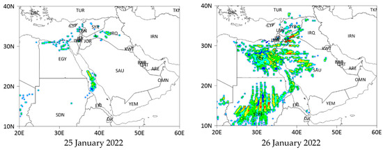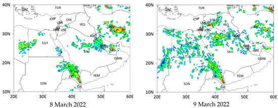 The HYSPLIT dust storm prediction results obtained using the validated model options for the period between 25–30 January 2022, are illustrated in Figure 10. Dust concentrations are relatively low across the Arabian Peninsula at the release start date of 8 March 2022. The central and eastern regions of Saudi Arabia, Libya, and Egypt are not significantly affected, with only minor dust activity detected. In contrast, dust injection areas in Central Iran experience significant dust loads. On 9 March, the dust storm intensifies slightly, particularly in northern Saudi Arabia. The dust storm’s impact on the eastern region of Saudi Arabia is not severe, although some elevated concentrations are observed further north. Dust concentrations increase toward the north and northeast of the domain in regions like Iraq and Syria.