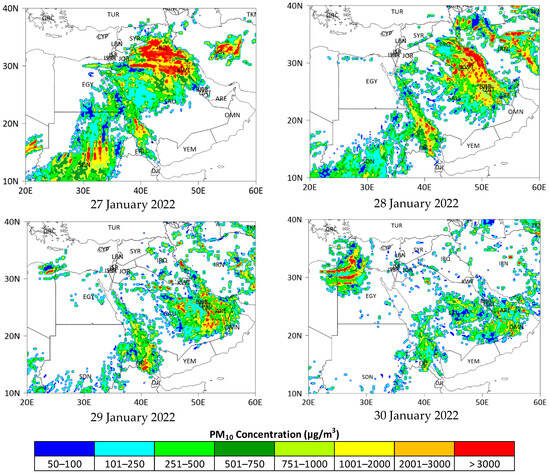 The HYSPLIT model’s dust storm predictions between 25–30 January 2022, using Scenario 5 with calibrated model parameters for a domain extending between latitudes 10° N and 40° N and longitudes 20° E and 60° E, are depicted in Figure 8. On 25 January, there is low to moderate dust activity in regions such as Egypt, Iraq, and the Red Sea, while the Arabian Peninsula remains primarily unaffected. The dust storm begins to develop more noticeably on 26 January. While the eastern and southern parts of Saudi Arabia still show minimal concentrations, there are clear signs of increased dust activity in the northern regions of the Arabian Peninsula. Moderate to high dust loads affect Sudan, Jordan, and surrounding areas such as Egypt, Iraq, and the northwestern parts of Saudi Arabia. By 27 January, the dust storm intensifies significantly, with dust moving from the northern regions into the Arabian Peninsula. The eastern region of Saudi Arabia, especially areas near Kuwait, is beginning to experience elevated PM10 levels above 500 µg/m3, indicating the start of the storm’s impact. Meanwhile, Iraq, Kuwait, northern Saudi Arabia, central regions of Iran, and Sudan face severe dust storms with PM10 concentrations exceeding 3000 µg/m3.