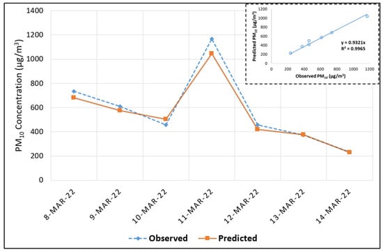 Observed and predicted PM10 concentrations between 8–14 March 2022.
