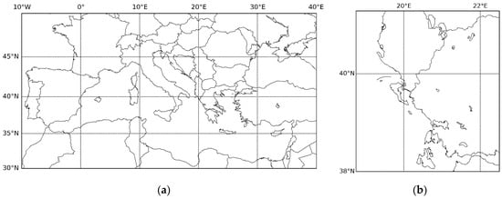 Geographical domains of Mediterranean region (a) and NW Greece (b), used for WT classification.
