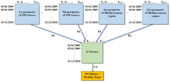 A multivariate methodological scheme including Factor Analysis (FA) and k-means Cluster Analysis (CA) is applied to the time series of the above meteorological parameters. Both statistical methods are widely used in atmospheric sciences [,,]. FA, which is actually a slight modification of the Principal Component Analysis (PCA) method, is a dimensionality reduction technique used to reduce the dimensions of the initial data, providing a small number of new uncorrelated variables (factors). Rotation of the axes is performed to maximize the physical interpretability of the factors while keeping the factors uncorrelated. In the present work, the varimax rotation is applied. The number of factors is decided using at first the scree criterion in order to obtain an order of magnitude for the number of factors [,]. Their exact number is then decided, taking into account the physical hypostasis of the results. This is achieved by ensuring that all factors show at least 1% of factor loadings above 0.7—a value that corresponds to approximately 50% (0.7 × 0.7 ≈ 0.5) of common variance between the factor scores and the corresponding time series of the initial data. K-means CA is a classification technique used for the classification of a large number of cases into distinct and homogeneous clusters. CA has two approaches: hierarchical and non-hierarchical. In the present work, the non-hierarchical k-means approach is applied []. The number of clusters is decided based on the “Jump” method suggested by Sugar and James []. According to this method, k-means CA is repeatedly applied for different numbers of clusters, and then the results are graphically projected to indicate the optimal number of clusters. In the specific case of the present work, FA is applied on the data arrays of the above meteorological parameters of the two geographical domains (19,719 time series), leading to 47 uncorrelated variables (factors) (Figure 2). More specifically, FA is applied each time on the data array of each meteorological parameter separately. The rows of the parameter matrices correspond to the number of cases (3652 days), while the columns represent the number of grid points in the area multiplied by the number of time points of the parameter. For the meteorological parameters of NW Greece, the number of columns is 1120 (224 grid points × 5 time points), while for that of Mediterranean region is 3213 (1071 grid points × 3 time points). For example, applying the FA on the data array of 2 m air temperature results in three time series of the factors (uncorrelated variables) that describe 97% of the variance in the initial data. All the 47 time series of the factors (factor scores), resulting from previous step for all the meteorological parameters, are gathered into one matrix. These 47 factor scores describe different amounts of variance in the initial data related to meteorological parameters, with values ranging from 58% for low cloud cover to 97% for 2 m air temperature. Then, CA is applied on this matrix, classifying the 3652 cases (days) into 10 distinct and homogeneous clusters. Each cluster defines a WT, which corresponds to characteristic patterns of the meteorological parameters in the two geographical domains.