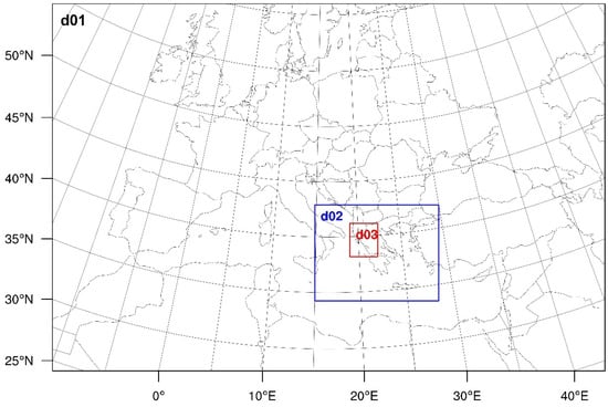 The Global Forecast System (GFS) forecast data at 0.5° × 0.5° spatial resolution are used to initialize the WRF model and provide lateral boundary conditions updated every six hours, as provided by National Centers for Environmental Information (NCEI). The WRF model in version 4.1.5 runs for a specific number of days of each WT. This number is considerably lower than the total number of cases (days), because of the fact that all the days classified in each WT are not necessarily considered as representative of it. A measure of the representativeness of a specific case for a WT is its distance from the corresponding cluster center. Thus, it is decided that the model runs for a specific number of cases, which is equal in all clusters for statistical comparison purposes. This number is 10% of the days of the most frequent cluster, which are characterized by the lowest distances from the corresponding cluster center, while also considering that there is no significant increase in the distance from the cluster center for any WT. This number is found to be 64. So, the WRF model runs for 640 days (64 days × 10 WTs). The model runs with initialization at 12 UTC for 36 and 60 h forecasts in order to acquire meteorological data for the first (t + 12 h to t + 36 h) and second (t + 36 h to t + 60 h) days of forecast, while the first 12 h are considered as the spin-up of the model. The one-way nesting technique is used for three domains (Europe–Greece—NW Greece) in a spatial resolution of 18, 6 and 2 km, respectively (Figure 3). The selected parameterizations of the physical processes of the WRF model are shown in Table 1, which are also the suggested default parameterizations for the mid-latitude areas and fine grid distances of the model []. This combination of default parameterizations has been chosen because it has been developed and tested by NCAR’s Mesoscale and Microscale Meteorology Laboratory over several years, and it was released as a physics suite of the WRF model [,]. These parameterizations have been found to be skillful and robust for forecasting applications focused on mid-latitude areas where continental convection occurs. All the selected parameterizations are applied for running the WRF model in all domains, apart from cumulus parameterization for the third domain (NW Greece), which is turned off by default. Generally, it is suggested [] that for domains with horizontal grid resolutions ≤ 4 km, cumulus parameterization schemes should not be used when the model can resolve the deep convective updrafts itself.
