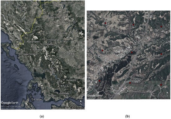 (a) Spatial distribution of meteorological stations used for assessment of air temperature (stations 1 to 11) and precipitation (stations 1 to 17) and (b) spatial distribution of 3 × 3 (9) surrounding grid points of Grevena station.