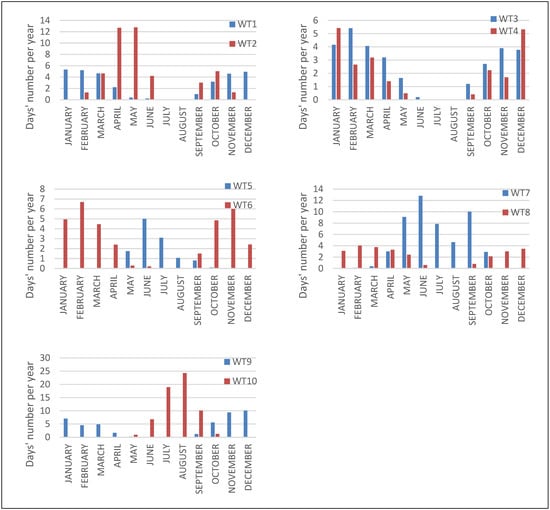 - WT10 appears in the warm period and is the most frequent WT. It is characterized by the combination between the Azores subtropical anticyclone and the SW Asia thermal low. This combination along with high static stability favors fair weather over the study area. The maximum of its frequency appears in August. Among the warm-period WTs, WT10 shows the lowest values of cloud cover over NW Greece (Figure A1j, Figure A2j and Figure A3j). Also, among all WTs, WT10 is characterized by the highest values of noon air temperature.