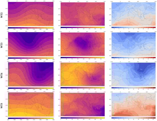 - WT5 is a warm-period WT showing the maximum of its frequency in June, and it is characterized by the combination between the Azores subtropical height and the SW Asia thermal low. In the area of NW Greece, only a few clouds appear over the Pindus mountain range (Figure A2e).