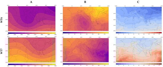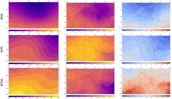 Mean 12 UTC 500 hPa (column A) and 1000 hPa (column B) geopotential height patterns (gpm) and 850 hPa air temperature (°C) (column C) for WTs 6–10.