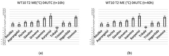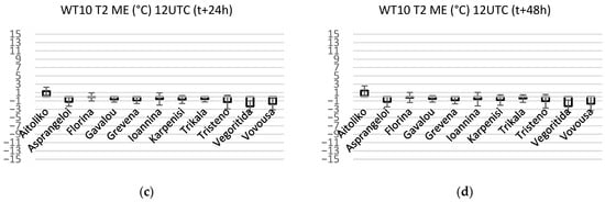 As shown in Figure 8 for WT10, the forecasts of 12 UTC air temperature are generally satisfactory, with mean errors generally below 1 °C. On the contrary, there are large errors in the 04 UTC air temperature, especially for the inland and mountainous stations, where the errors are about 8 °C. So, the model systematically overestimates the early morning air temperature, especially over the mountainous areas. The only exception is the station of Trikala, which is a lowland station east of the Pindus mountain range and presents a very good forecast skill for both 04 UTC and 12 UTC air temperatures. The largest errors of 2 m air temperature at 04 UTC occur at station Karpenisi, which is located 700 m above sea level, and the station Vovousa follows, which is located 1024 m above sea level. Also, it has to be mentioned that both stations are located in small canyons with a remarkable altitude increase over small distances, affecting the local weather characteristics. The terrain near these stations cannot be modeled properly by the WRF model due to fact that the 2 × 2 km horizontal resolution cannot capture such abrupt changes in the relief. Also, the differences between the real and weighted altitudes at the locations of Karpenisi and Vovousa stations are 173 and 225 m, respectively. As mentioned in methodology, the values of modeled temperature are corrected based on an empirical lapse rate of 6.5 K/km. This correction may be misleading for these stations, especially when temperature inversion conditions prevail over the corresponding regions.