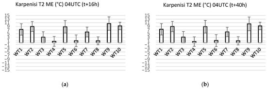 For the evaluation of air temperature at 2 m, the mean error and standard deviation are calculated for each WT and meteorological station separately at 04 UTC and 12 UTC for the first and second days of forecast. The mean error is defined as the modeled minus the observed value (tmodeled − tobserved); thus, a positive value of mean error indicates an overestimation of air temperature by the model. The results of the evaluation are presented for WT10, which is the most frequent WT in the study area, in Figure 8.