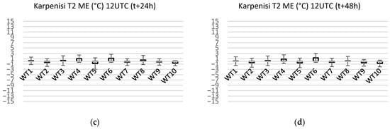 Graphical representation of mean errors (in °C) and standard deviations of the differences between forecasted and observed values of 2 m air temperature (T2) for all meteorological stations for WT10 at (a) 04 UTC of the first day of forecast (forecast value t + 16 h) (b) 04 UTC of the second day of forecast (forecast value t + 40 h) (c) 12 UTC of the first day of forecast (forecast value t + 24 h) and (d) 12 UTC of the second day of forecast (forecast value t + 48 h).