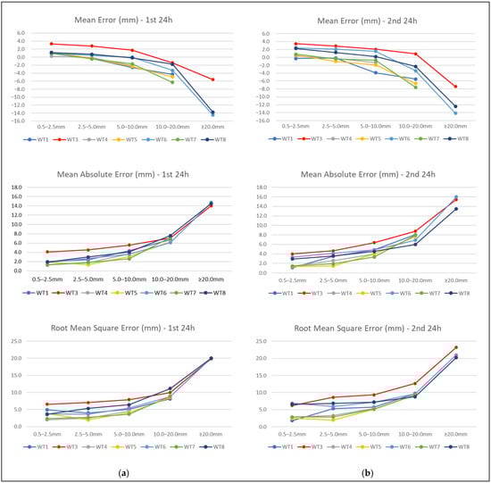 Mean error, mean absolute error and root-mean-square error for (a) first (t + 12 h to t + 36 h) and (b) second (t + 36 h to t + 60 h) days of forecast for each WT and for five precipitation classes.