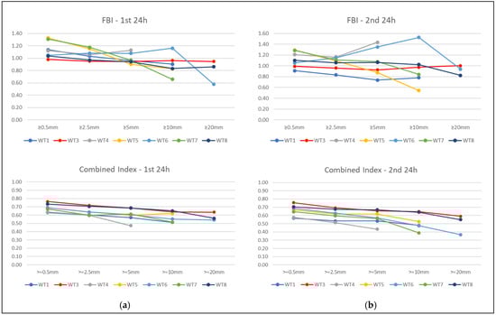 FBI and Combined Index (see Equation (3)) for (a) first (t + 12 h to t + 36 h) and (b) second (t + 36 h to t + 60 h) days of forecast for each WT and for five precipitation thresholds.