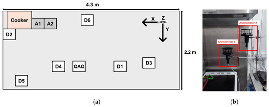 Two Gill Instruments WindSonic M ultrasonic 2D anemometers [41] were placed in the vicinity of the cooker to monitor airflow around the cooking source. This type of anemometer is more commonly used outdoors but is robust and has a good time resolution (0.25 s), and anemometers of this brand have been successfully used in similar environments previously [42,43]. The anemometers measured velocity in the x- and y-direction only—these directions are illustrated in Figure 2a—and a close-up of the location of the anemometers is shown in Figure 2b. For the locations of these and all sensors within the DOMESTIC kitchen laboratory, see Figure 2a and Table 1.