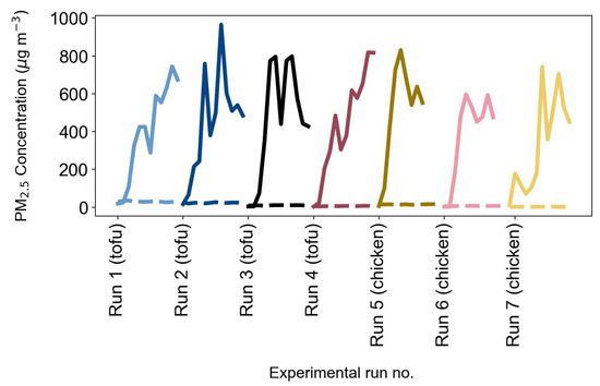 The guaranteed sensing range of the NuWave sensors should be borne in mind when interpreting these peaks; however, even making an allowance for a reduction in accuracy above concentrations of 1000 μ , it is clear that the 12 min stir fry increased PM2.5 within the breathing zone of the kitchen laboratory by several orders of magnitude. This is further borne out by the results from the QuantAQ sensor, positioned in the centre of the kitchen laboratory, which showed rather more standardised readings across the seven runs, with peaks of around 800 μ (see Figure 3). These concentrations align with those observed by O’Leary et al. for a similar cook [48], albeit at a greater ACR (around 3 h−1 vs. 0.77 h−1). They are, however, considerably higher than the maximum of 400 μ reported by Farmer et al. in the HOMEChem study [20] when stir-frying a similar recipe. In the latter study, an HVAC system was used, which would have mitigated the indoor concentration levels. As most interior room doors were left open in the 250 m3 UTest house during the HOMEChem cooking experiments, the mixing volume in the HOMEChem study was also much greater than that in DOMESTIC, which, again, likely reduced the observed concentrations. The difference seen in the DOMESTIC PM2.5 readings dependent on sensor position in this study indicates the importance of using a multi-point sensor approach when assessing the impact of an indoor pollutant source on the surrounding environment. Clearly there is the potential for considerable spatial variation in concentrations even in a relatively small space. Of course, in a real-life kitchen, there is likely to be considerably more mixing, due to additional human movement and ventilation sources. However, even accounting for this, the existence of localised zones of higher PM2.5 concentration should be considered.