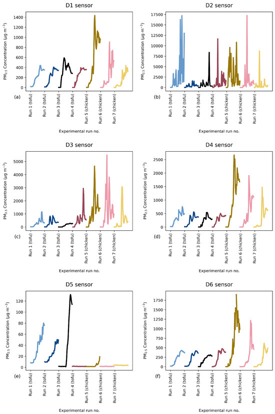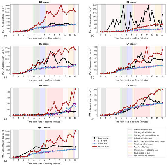 Number size distributions—that is, the contribution of particles of various diameters to the total particle count—are of interest when conducting air quality investigations. This is because particles in the accumulation mode, around 0.01–1 µm diameter, remain airborne and stable for considerably longer than those that are either smaller (which tend to agglomerate to accumulation mode size) or larger (which normally deposit at a faster rate, dependent on respective densities) [65]. This then has implications for longer-term exposure. Figure A3 shows the mode particle diameter measured by the NuWave sensors during the seven stir fry cooking experiments. This was around μ, that is, in the accumulation mode. The mode diameter increased over the course of the experiment, peaking for all sensors except D5 soon after the chicken/tofu was added to the pan (with the highest reading being at the D2 sensor, around μ, before decreasing again). It is likely that the addition of the cold protein source to the hot oil generated the rapid production of larger particles via the ejection of oil droplets from the pan, and this effect was then reduced once the mixed vegetables, noodles, etc., were added. The full data on particle counts for PM0.5, PM1, PM2.5, PM4, and PM10 for all experimental runs can be found at the STFC Research Data Depository [50]. In terms of the relative contribution of PM1 to PM2.5 concentrations, there is some disagreement between the NuWave and QuantAQ sensors. According to the NuWave readings (except for D2, the sensor closest to the source), the majority of the mass of PM2.5 was made up of particles of under μ in diameter, while the QuantAQ sensor indicated that around 50% of the mass concentration was made up of PM1 (see Figure A4). The QuantAQ sensor was relatively near NuWave sensors D1 and D4, and along the same plane in the kitchen laboratory, so it seems unlikely that this was a regional variation. While the NuWave readings are in the majority, the QuantAQ ratios agree with Farmer, 2019 [20], and, hence, for the modelling, these are the data that informed the particle size range chosen for the computational model. The disparity does, however, illustrate another challenge of using low-cost sensors, which is that calibration processes may vary quite considerably, and the particles used for calibration are often chemically and physically dissimilar to the type of particulate matter commonly generated by cooking [48]. It is likely that at least part of the disparity seen here between the sensor types can be attributed to different calibration protocols.