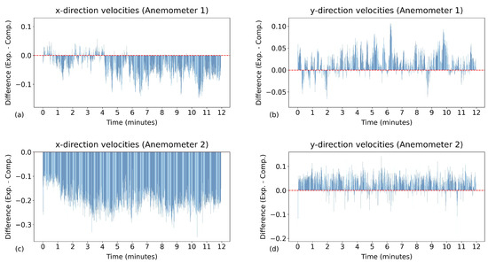 Differences between the mean experimental x and y velocities at anemometers 1 and 2 and the velocities predicted by the WALE 170 million cell mesh model (Exp. = experimental, Comp. = computational). As the experimental velocities oscillated widely, velocities have been averaged over 1-s intervals in order to better visualise trends.