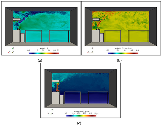 (a) X and (b) Y velocities across a plane intersecting with the frying pan within the DOMESTIC model. (c) Temperatures across a plane intersecting with the frying pan within the DOMESTIC model. All images are from the 170 million cell WALE case, and the results shown are from the final minute of the 12 min cooking period.