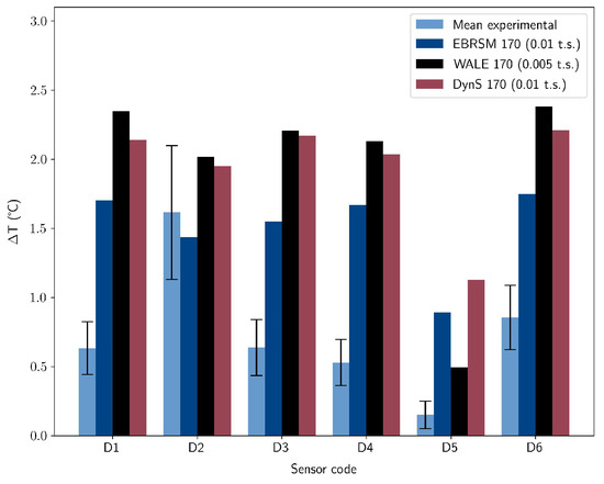 Comparison of mean experimental ΔT with those predicted by the Dynamic Smagorinsky, WALE and EBRSM 170 million cell mesh models (t. s. = time step).