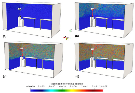 Particle dispersion across two planes in the kitchen laboratory after (a) 1 min, (b) 4 min, (c) 8 min and (d) 12 min. Results from the 170 million cell WALE case.