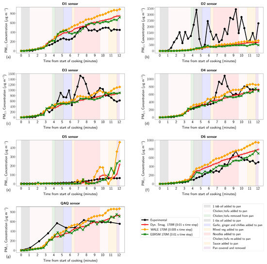 Increasing the mesh resolution to 170M cells generally improved the fit to the experimental results. This was expected as (for LES) mesh refinement not only improves the accuracy of the physics of the fluid flow via better resolution of the large eddies, but also improves the accuracy of particle deposition mechanics [66,67]. The connection between mesh resolution and accuracy is more complex for the RANS/EBRSM approach, but, again, it should still improve particle deposition mechanics. Some overestimations were observed, particularly at D1 and D6 (Figure 11a,f), and the overestimations at D5 seen in the 40 million cell cases were also apparent (see Figure 11e). Readings at D2 were also still underestimated (Figure 11b) although this underestimation decreased for the LES cases. All cases demonstrated a relatively linear increase in PM2.5 concentrations at all sensors except D5. This is in contrast to the experimental results, which showed specific peaks, most especially at the point at which the noodles were added to pan and cooked, between minutes 6.5 and 9.5. The steady emission rate assumption used in the model appears to be insufficient to represent the experimental emission rates, which apparently varied significantly, and not necessarily predictably (judging from the individual experimental results seen in Figure 4). The model emission rate was based on the work of O’Leary et al. [48], who, using six repeats, found the mean emission rate for a similar dish that ranged between 2.3 and mg min−1 depending on the experimental run. It is likely that the use of a variable emission rate within the model would more accurately capture the evolution of concentrations, although establishing the appropriate timing and scale of these variations in experimental conditions would be challenging due to the sheer intrinsic variability of such experiments. In contrast, at sensor D2 (Figure 11b), while the 170 million cell cases showed higher concentrations at this sensor than the 40M cases, they were still, at the majority of points, many times lower than the experimental results. As discussed above, it is possible that the PM2.5 concentration readings at the D2 sensor were distorted by the steam generated during cooking, due to the proximity of this sensor to the cooking source. The lower concentrations observed in the simulations are likely due to a combination of this fact and the need for the gusting steam present in the experimental conditions to be better represented in the model. In addition to a more in-depth consideration of the variability of the source emission rate, the incorporation of non-spherical particles, and the exploration of the potential impact of particle coagulation, is also recommended for future research. Once reliable results can be produced in sealed conditions, the model could then be expanded to include ventilation scenarios, to investigate the most efficient mitigation strategies to protect householders during cooking.