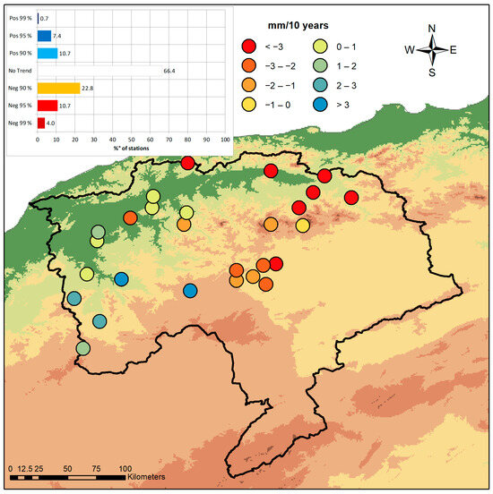 This study revealed diverse changes in the annual maximum daily precipitation in the analyzed area. Predominantly decreasing trends were identified, encompassing 22.8% of the data series at a significance level of 90%, 10.7% at 95%, and 4.0% at 99%. These results are confirmed by Bouklikha et al. [25], who identified monthly precipitation trends in north-western Algeria and by Kessabi et al. [26], who demonstrated a decrease of −20% to −40% in total annual precipitation in northern Morocco. The negative precipitation trends in north-western Algeria are associated with an increased risk of drought [27].