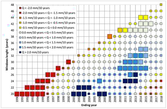 To capture the entire possible spectrum of significant trends in the series and thus obtain the best possible detailed information, an ongoing trend analysis was carried out. The slopes of the trends were estimated within time windows ranging in width from 20 years to the entire length of the series (48 years). The identified trends were presented in graphs for better visualization, with the y-axis indicating the width of the time window and the x-axis indicating the last year of the time window to which the trend refers. The value of the trend is represented by the colour of the corresponding pixel and the significance level by the size of the square, large squares are plotted for p < 0.05 and small squares otherwise. The result shows that the annual maximum daily precipitation decreases significantly in the first 20–30 years of observation and over the entire period, but to a lesser extent, as a significant increase was observed in the last 20 years (Figure 3).
