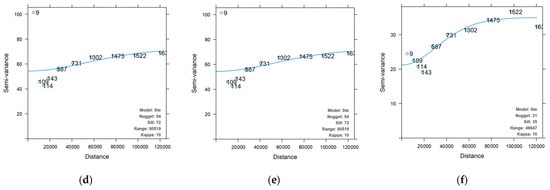 Experimental variograms with different temporal segments: (a) the full-time series, (b) 1970–1980, (c) 1980–1990, (d) 1990–2000, (e) 2000–2010, and (f) 2010–2017. In the X-axis, distance is expressed in metres.