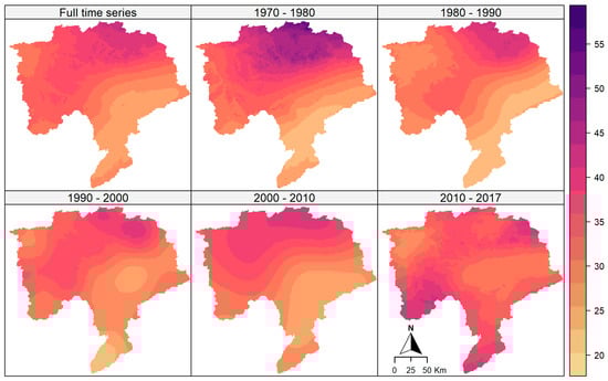 The sequence of decadal spatial distributions in Figure 5 shows the temporal changes in the distribution of maximum daily precipitation in the region. Two main behaviours can be identified: periods with higher precipitation concentrated in certain areas and periods with evenly distributed, lower precipitation. In particular, for the full-time series and the period of 1970–1980, higher precipitation values (above 50 mm) are concentrated in the northern part of the region. On the contrary, precipitation from 1980–1990 to 2010–2017 shows lower maximum values more evenly distributed across the region. Specifically, in the more recent periods (2000–2010 and 2010–2017), the intensity is lower than in the previous periods in the northern areas, with maximum values below 35 mm. This indicates a possible decrease in extreme daily precipitation events, which regional climatic changes might cause.
