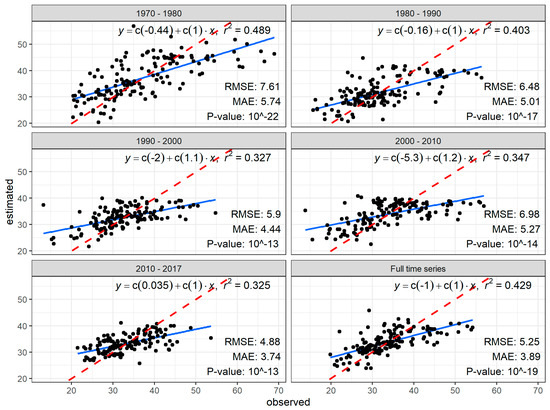 The regression results between the observed and the estimated daily maximum precipitation values show remarkable differences in the quality of the estimates in the different decades (Figure 6). The period of 1970–1980 and the entire time series show the highest R2 values (0.489 and 0.429, respectively), indicating a moderate match between observed and estimated values. The RMSE and MAE are 7.6 mm and 5.7 mm for the period of 1970–1980 and 5.3 mm and 3.9 mm for the complete time series. In the period of 1980–1990, R2, RMSE, and MAE are 0.4, 6.4 mm, and 5 mm, respectively, with a slight deviation from the ideal line of 1:1, which indicates a moderate tendency to underestimate the observed values. A similar pattern can also be observed for the period of 2000–2010, with an R2 of 0.347.