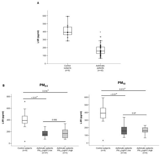 (A) LSR level in control subject and asthmatic patients. (B) LSR levels in control subjects and asthmatic patients by level of PM 2.5 and PM 10 μg/m3. * p < 0.05, control subjects vs. asthmatic patients.
