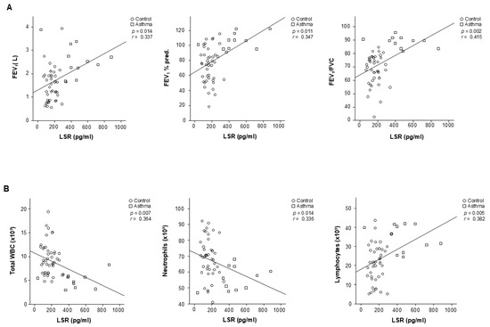Relationship of LSR with (A) FEV1 (L) (r = 0.337, p = 0.014), FEV1% predicted (r = 0.347, p = 0.011) and FEV1/FVC (r = 0.415, p = 0.002). (B) WBC (r = −0.364, p = 0.007), neutrophils (r = −0.336, p = 0.014), and blood lymphocyte proportion (r = 0.382, p = 0.005) in control subjects and patients with asthma.