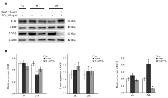 LSR, RAGE, and TGFβ protein determined by Western blot in NHBE cells treated with 10 μg/mL Dermatophagoides pteronyssinus 1 (Derp1) and 100 μg/mL TiO2 for 4, and 24 h. (A) NHBE cells protein level of RAGE, TGFβ and LSR as determined by Western blot. (B) Densitometric data from the Western blots. Densitometry was determined with 3 immunoblots and normalized to β-actin. Data are expressed as means ± SD. Scale bar means 100 μm. * p < 0.05 vs. normal control (NC).