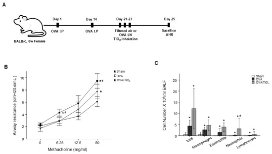 (A) Experiment protocol of TiO2 exposure model. (B) Airway hyperresponsiveness (AHR) and inflammation in OVA mice. (C) Total and differential cell count in bronchoalveolar lavage fluid (BALF). BALF was collected on day 25 and cell differentials determined. Values are means ± SEM (n = 6 mice/group). * p < 0.05 vs. sham. # p < 0.05 vs. OVA.
