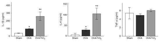 Although the TNF-α levels were not different between the three groups, the OVA mouse group had resulted in an increase in IL-1β and IL-4, and a greater increase in OVA/TiO2 mice (Figure 5) by ELISA using protein lysates from the lungs. These findings indicate that TiO2 exposure amplifies allergen-induced cytokine production, which may contribute to the observed exacerbation of airway inflammation.