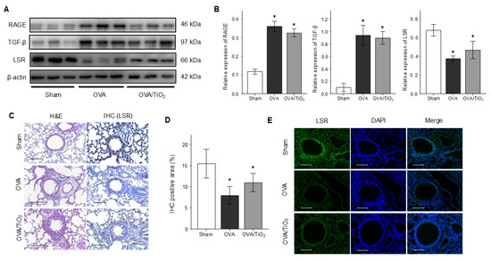 OVA mice had resulted in a decrease in LSR and in increase in RAGE and TGFβ (Figure 6A,B). Moreover, OVA/TiO2 mice resulted in a change in RAGE, LSR and TGFβ (Figure 6A,B). Further alterations in these markers were observed in OVA/TiO2 mice, corroborating the in vitro findings. Additionally, IHC staining and immunofluorescence revealed that LSR expression had decreased in the lungs of OVA mice compared with control mice, and changed in OVA/TiO2 mice (Figure 6C–E). These results emphasize the critical role of tricellular tight junction proteins, particularly LSR, in maintaining epithelial barrier integrity in the context of asthma and pollutant exposure.