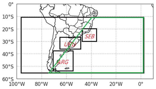 The study area encompasses South America and the South Atlantic Ocean. In Figure 1, the large area outlined by the black square, which also includes the South Pacific Ocean, represents the region used for tracking cyclones. Analyses will be conducted for specific subdomains—Southeast and South Brazil (SEB), Uruguay and extreme south of Brazil (URU), and Argentina (ARG)—as well as for the entire South Atlantic Ocean. Note that the latter (indicated by green lines) includes not only the ocean but also part of the eastern coast of South America (approximately 200 km inland), though it does not encompass the entire subdomains.