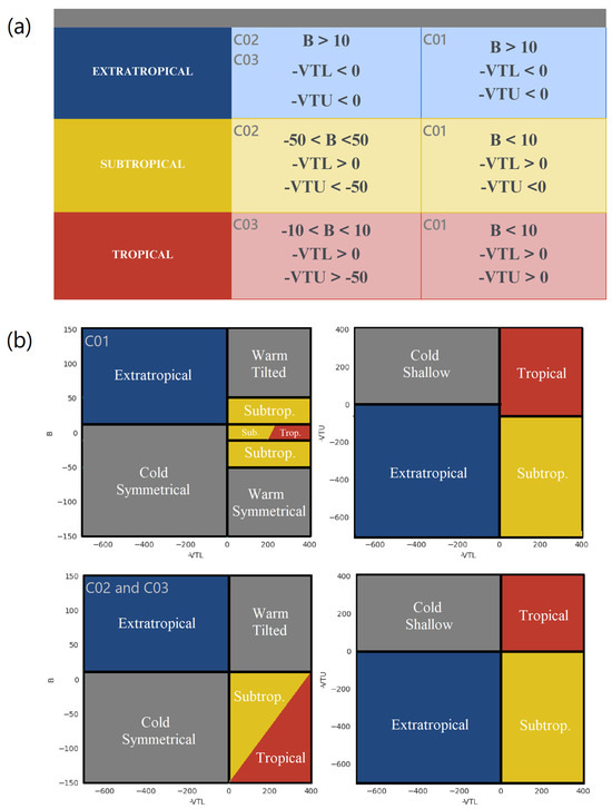 (a) CPS thresholds used for the cyclone’s classification following the criteria: C01 [39], C02 [11], and C03 [34]; (b) CPS quadrants delimiting the cyclone phase, B versus (left) and versus (right) to C01, C02 e C03 criteria.