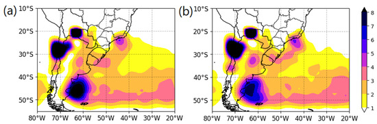 The SEB region is the most favourable area for the occurrence of subtropical (Figure 11b) and tropical (Figure 11c) cyclogenesis. As shown by [53], this region has great genesis potential, as indicated by the GPI index of [54], which evaluates key atmospheric and oceanic variables for tropical systems. For both subtropical and tropical cyclogenesis, a considerable number of events are observed south of 40° S. Some of these cases might be mesoscale cyclones (polar lows), but further studies are required to confirm this. It is important to note that this is not an issue with the cyclone identification and classification method, as the results align with those reported in [38,39].