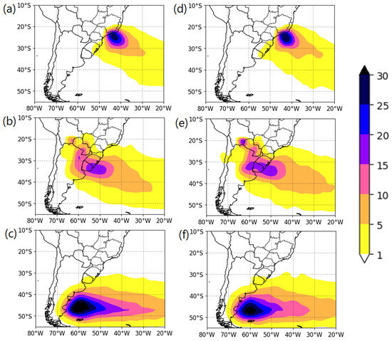 Mean annual density of cyclone’s trajectory with genesis in the subdomains for the common period 1979–2010 for: (a,d) SEB, (b,e) URU, and (c,f) ARG for ERA20C (left column) and ERA5 (right column). Density unit: number of cyclones by area (km2) ×105 per year.