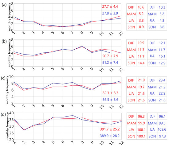 Cyclogenesis annual cycle (events/month) in ERA20C (red line) and ERA5 (blue line) in the common period (1979–2010) for: (a) SEB, (b) URU, (c) ARG, and (d) the South Atlantic (green box in Figure 1). The numbers on the right bottom side of the panels indicate annual mean and standard deviation, while the right side boxes present the seasonal mean for ERA20C (red) and ERA5 (blue).