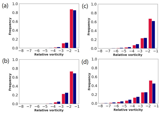 Histograms of the relative vorticity (×10−5 s−1) at cyclogenesis for the common period (1979–2010) for ERA20C (red) and ERA5 (blue) in subdomains: (a) SEB, (b) URU, (c) ARG, and (d) South Atlantic (green box in Figure 1).