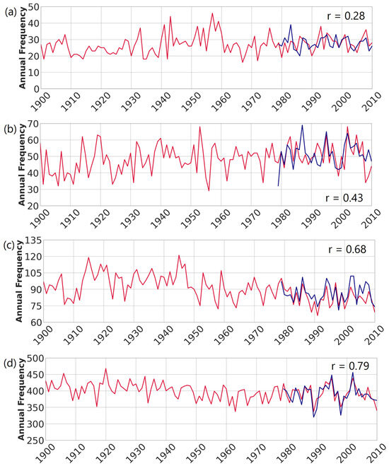 Time series of the annual frequency of cyclogenesis (events year-1) in ERA5 (1979–2010; blue) and ERA20C (1900–2010; red) in subdomains: (a) SEB, (b) URU, (c) ARG, and (d) Atlantic (green box in Figure 1); r is the Pearson correlation calculated between ERA20C and ERA5 for the period 1979–2010.